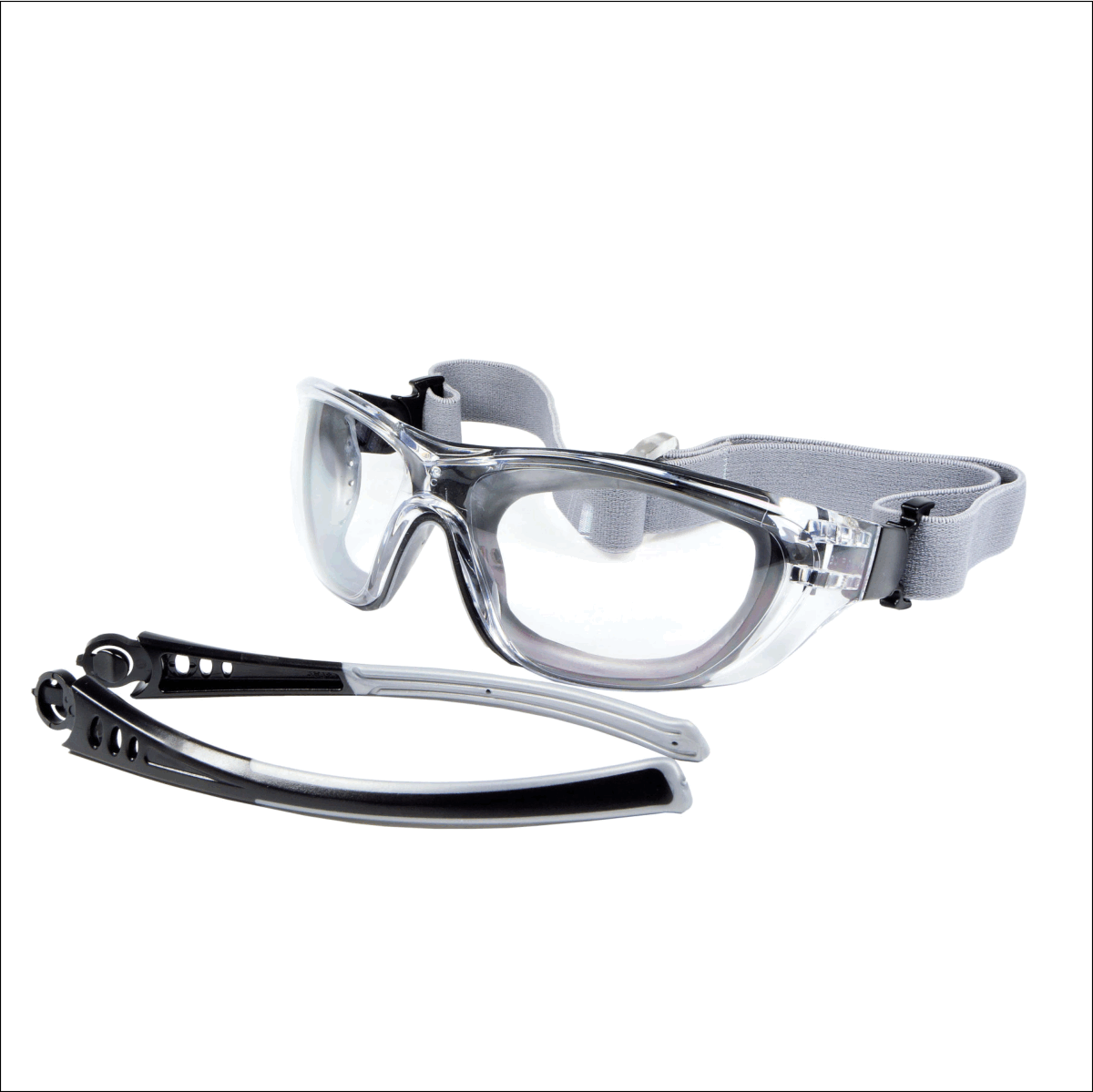 - ◈ Hybrid-System: Blitzschneller Wechsel zwischen Panoramabrille mit Bügeln und Vollsichtbrille mit elastischem Gummiband.